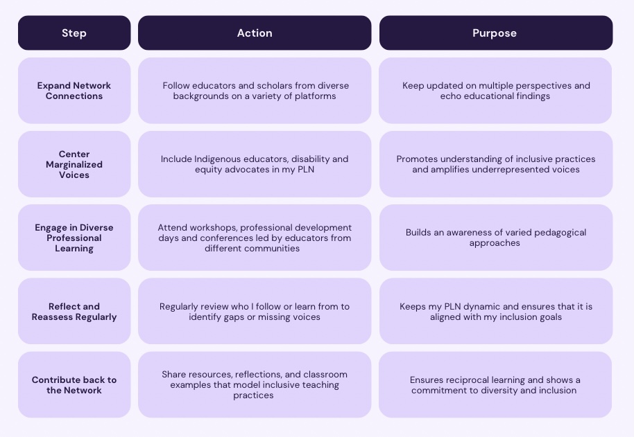 Thinking about how this connects to my own growth, I’ve realized that building an inclusive PLN takes real intention. It’s not just about following people who post about education, but making sure I’m learning from voices with different experiences and perspectives. Here are a few steps I plan to take to make sure my PLN reflects the kind of diversity I want to bring into my classroom: