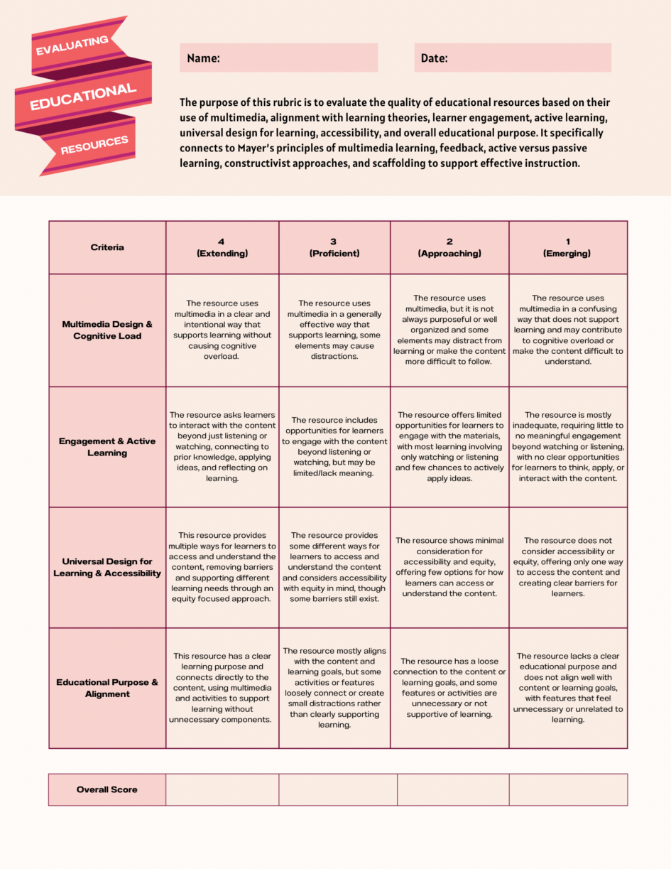 Khan Academy is an excellent educational tool that connects well with all the criteria provided in the rubric list. The multimedia is clean and thoughtfully utilized on this website, which avoids cognitive overload in the videos by providing clear explanations instead of a lot of visual content. Most videos are whiteboard style with spoken content, which helps the learner understand the content properly without sparking confusion or overwhelm. The learner can also use subtitles, transcripts, and a highlight and speak option on these videos.