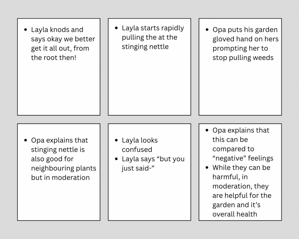 It was really encouraging to hear that the tone of my comic came across as “compassionate and non-stigmatizing.” Since I chose the theme of anxiety and depression, I wanted to take an approach that isn’t always prioritized, my goal was to show they’re just parts of a natural system that need a bit of maintenance. My peer really liked the garden metaphor by comparing emotions to weeds that aren’t “bad” but just need balance. They also mentioned that the relationship between Layla and her Opa felt warm and safe, which I’m glad about because I wanted that bond to feel grounding.