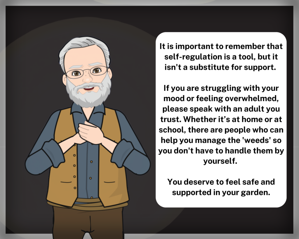 The most helpful suggestion was about the limits of self-regulation. My peer suggested showing that sometimes, a “weed” or an “anxious thought” can be too much on your own. I’m going to add a final panel that serves as a reminder that self-regulation is a tool but not a substitute for support. This serves as a low-pressure way to tell the reader that it’s okay and smart to go find a trusted adult when emotions feel a bit heavy to carry on their own.